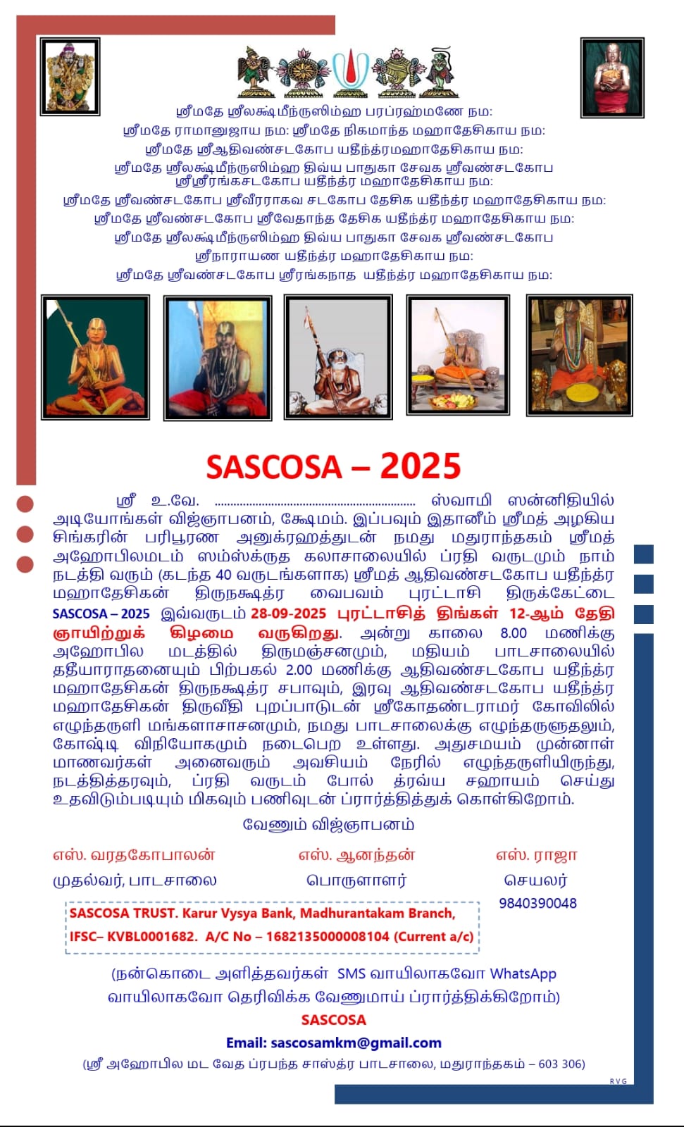 This Mahavidyalaya was one of the oldest Institutions teaching Sanskrit in this country. It was established by the peerless preceptor, the 42nd Jeeyar of Sri Ahobila Math, Injimedu Srimad Azhagiyasingar in 1942 to teach Veda, Prabandha, Sastra and Sanskrit, all under one roof, in the traditional Gurukula style with a hostel attached.