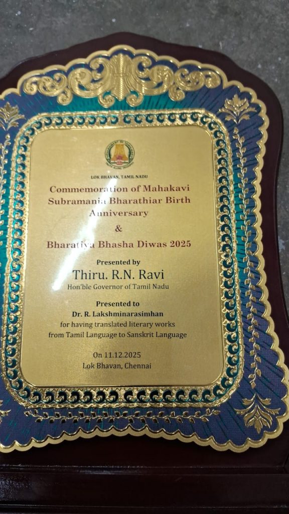 Asst. Professor Lakshmi Narasimhan receiving Award from TN Governor Hon’ble Thiru R.N Ravi for having translated literary works from Tamil Language to Sanskrit Language.